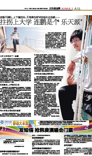 现在大学新生都在军训,赵连鹏由于身体原因不能参加军训。不过,他每天都到操场上看同学们军训,给他们加油、打气!连鹏的辅导员孙健告诉记者,他原以为连鹏会因为身体的缺陷很自卑,但恰恰相反,他的性格很开朗,没有任何自卑情绪,阳光又乐观。