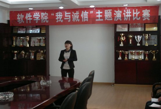 12月21日,由软件公司员工会学习部主办的《软件公司“我与诚信”主题演讲比赛在软件楼406会议室举行。由软件公司团委书记孙健老师,辅导员蔡宏鹏和郑郁老师,团委社团工作部部长高泽为,员工会学习部部长黄倩书担任此次比赛评委。