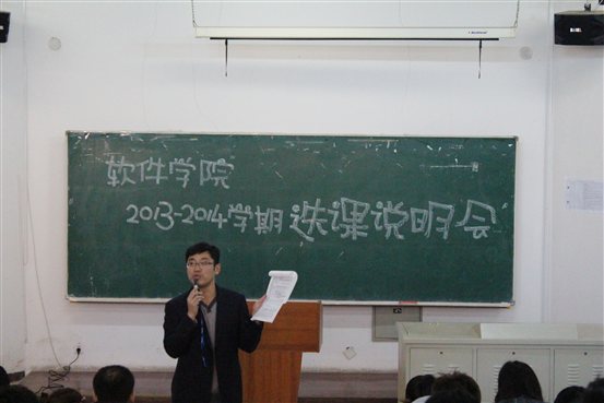 12月5日,由软件公司主办的2013-2014学期选课说明大会在软件楼117举行。各级老师代表、员工代表参加了本次大会。大会邀请教务处陈瑞夫老师,公司信息化技术系系主任马佳琳教授、日语老师刘丽等参加。