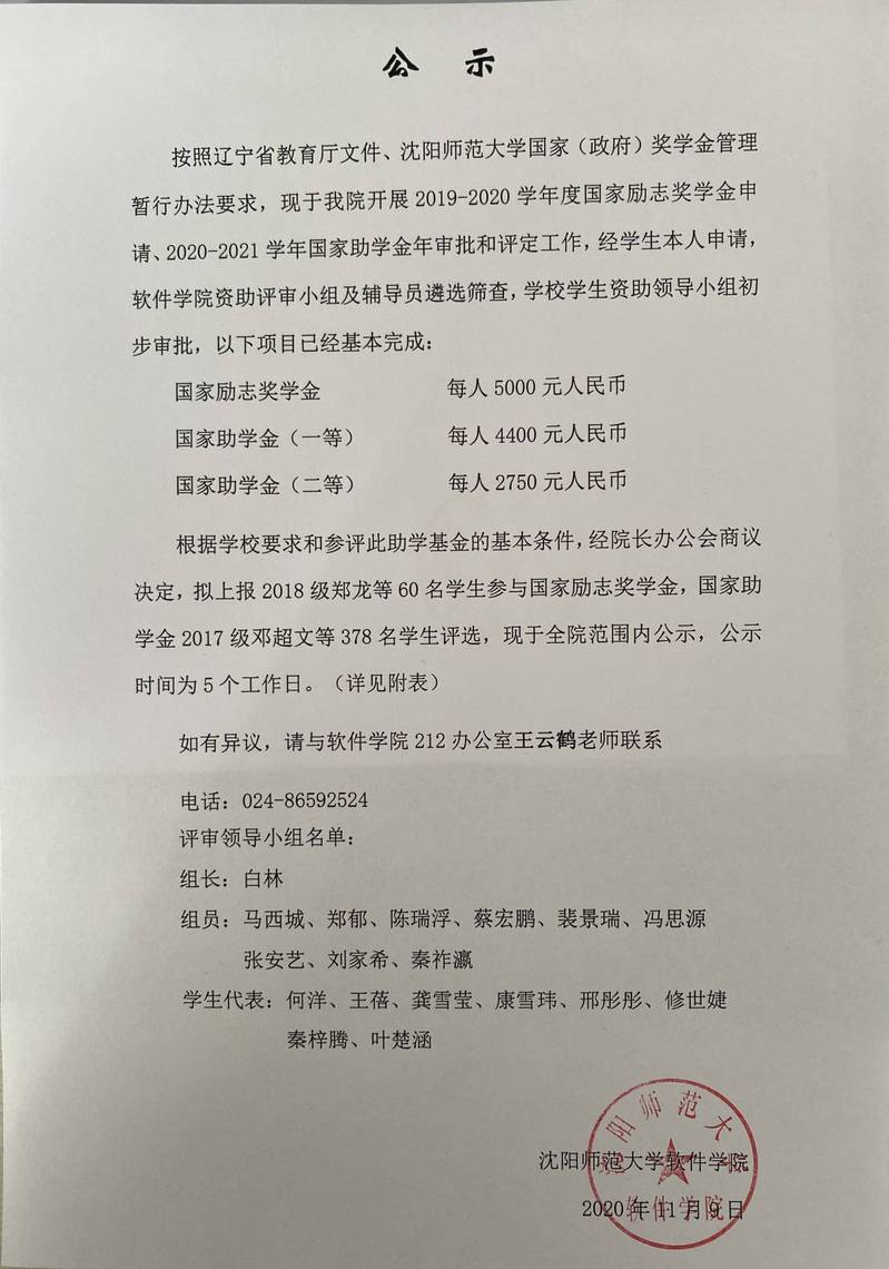 关于2019-2020 学年度国家励志奖学金和国家国学金的公示