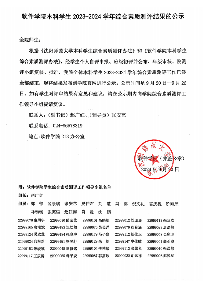 软件公司本科员工2023-2024学年综合素质测评结果的公示