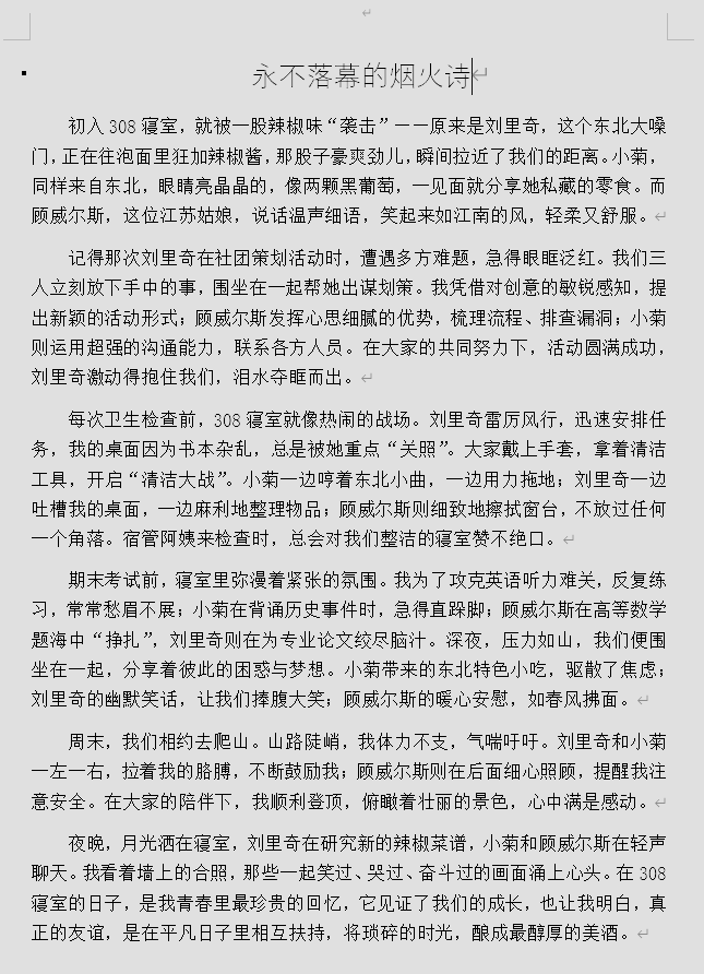 手指在键盘上跳舞,敲击出一串串触动人心的文字,同学们将室友间的的故事转化为文字,将生活中的酸甜苦辣咸都娓娓道来,使人仿佛置身其中。这些文字见证了同学们大学的美好时光,成为了青春岁月的美好见证。
