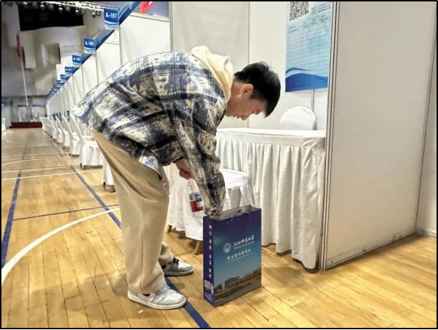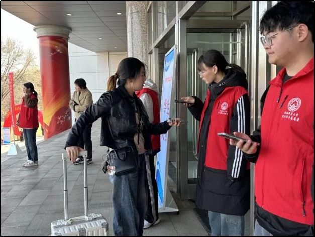 为了维持双选会现场的秩序,志愿者们时刻关注着场内动态。引导毕业生有序排队,提醒大家保持安全距离,避免出现拥挤混乱的情况。同时,志愿者们耐心地向每一位毕业生介绍获取电子门票的简单流程,帮助大家解决疑惑,引导他们有序完成验票入场,为双选会的顺利开展营造了安全有序的环境。