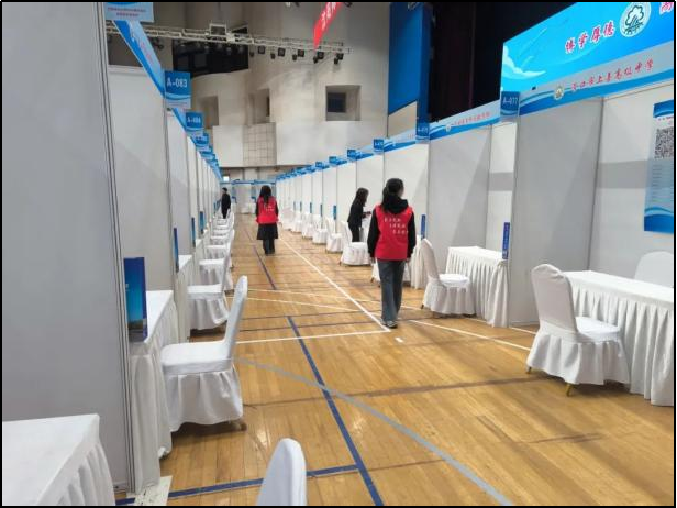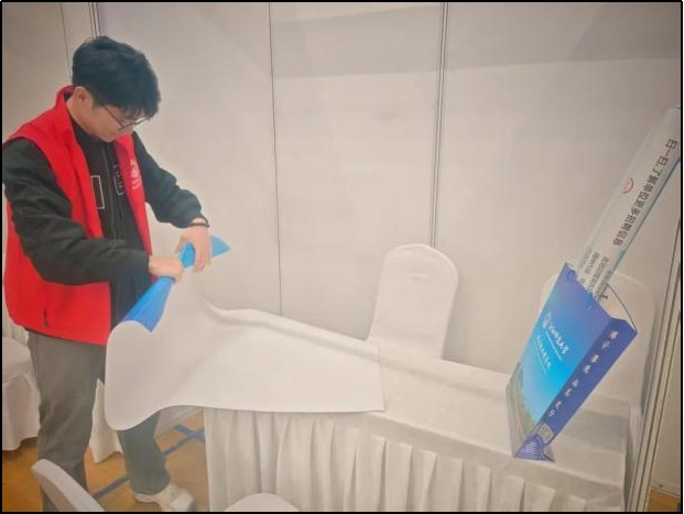 为确保本次毕业生双选会顺利开展,志愿者们提前一天完成场地分区、海报张贴、物资准备、桌椅摆放等系统化的场地筹备工作,确保活动当天各项准备工作顺畅有序。